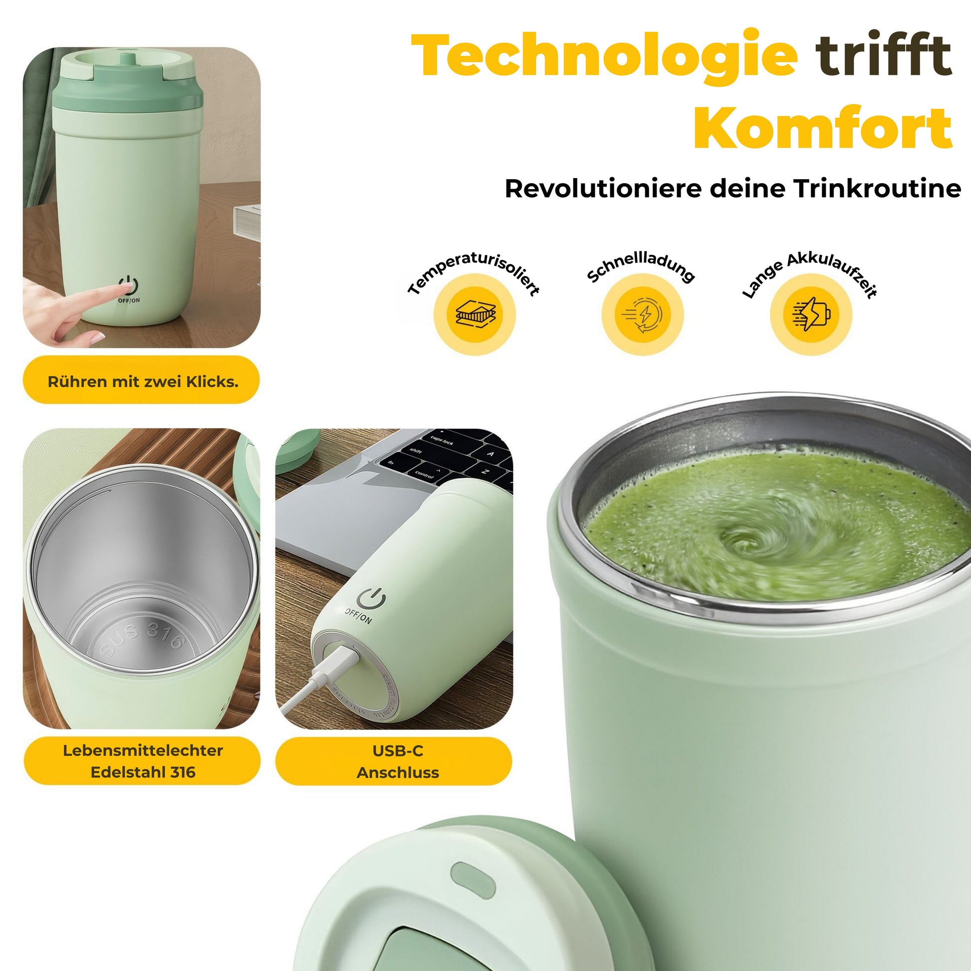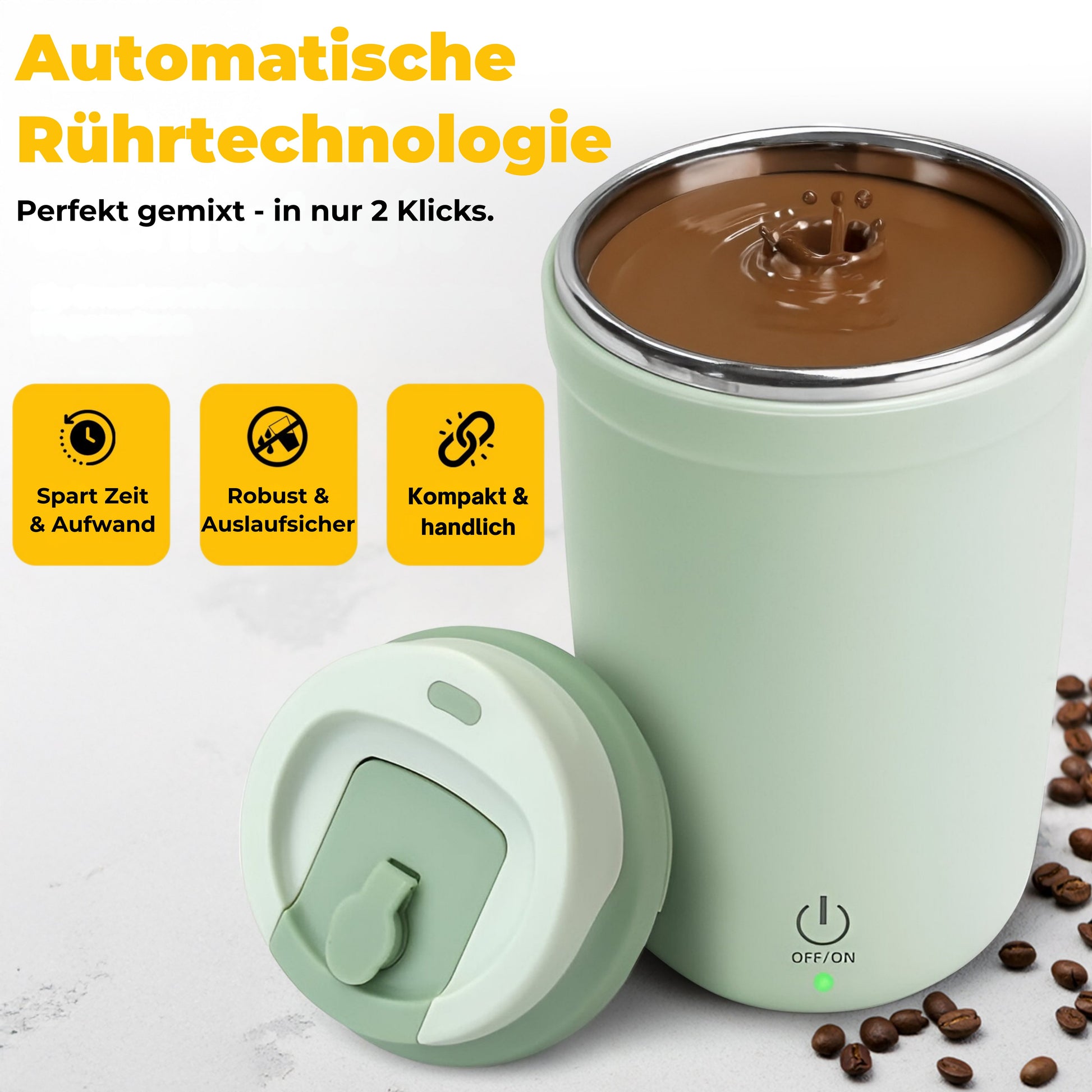 Der Becher verwendet einen magnetischen Rührkern, der durch die Basis automatisch in Bewegung gesetzt wird. Mit nur einem Knopfdruck wird dein Getränk sanft und gleichmäßig gemischt – ohne Schütteln oder Löffel.
